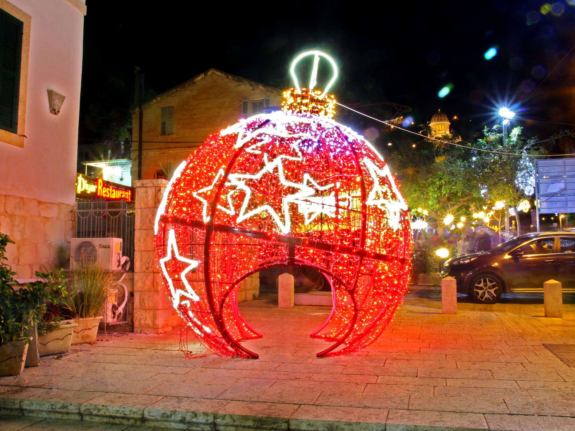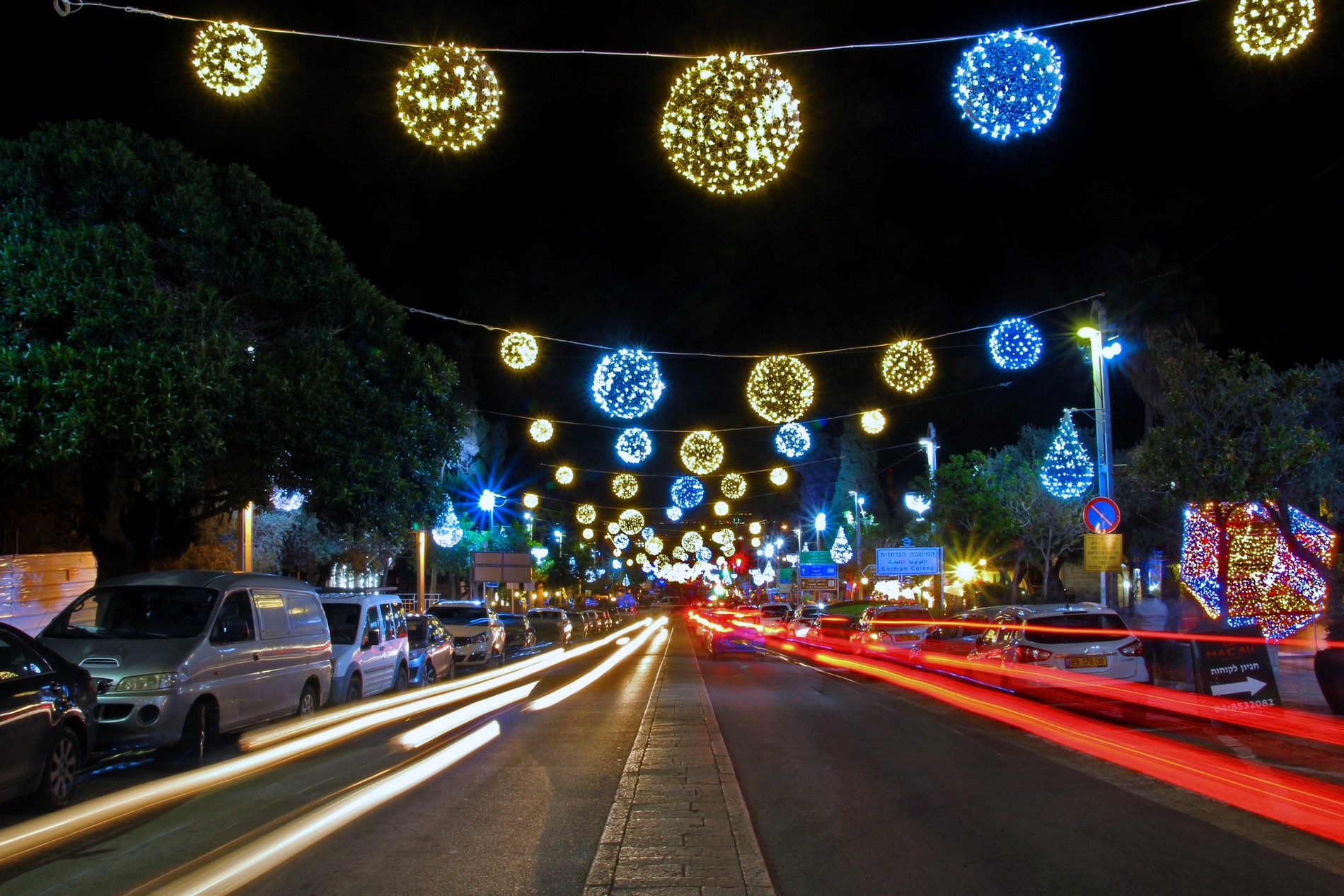 2. Німецька колонія (Мошава Ґерманіт) — красива вулиця з різдвяною ілюмінацією та видом на Бахайські сади.